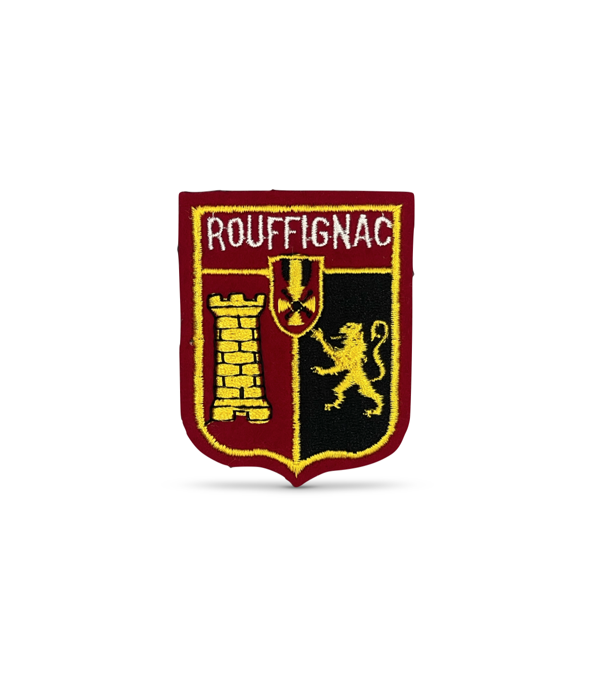 Ecusson brodé sur feutrine rouge.